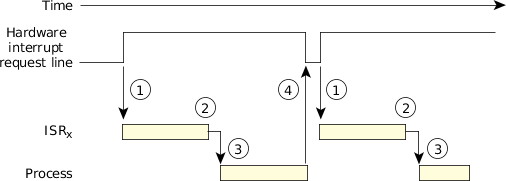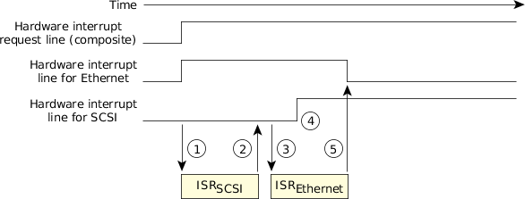The Ethernet device interrupted first. This caused the interrupt line to be asserted (active-going edge was noted by the PIC), and the kernel called the first interrupt handler in the chain (the SCSI disk driver; step 1 in the diagram). The SCSI disk driver's ISR looked at its hardware and said, "Nope, wasn't me. Oh well, ignore it" (step 2). Then the kernel called the next ISR in the chain, the Ethernet ISR (step 3). The Ethernet ISR looked at the hardware and said, "Hey! That's my hardware that triggered the interrupt. I'm going to clear it." Unfortunately, while it was clearing it, the SCSI device generated an interrupt (step 4).