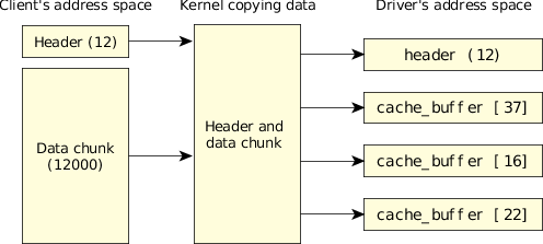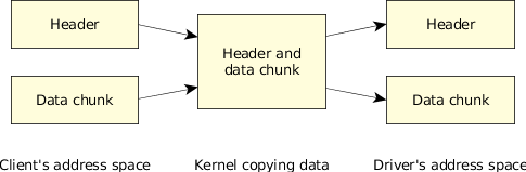 Since the kernel is going to copy the data anyway, it would be nice if we could tell it that one part of the data (the header) is located at a certain address, and that the other part (the data itself) is located somewhere else, without the need for us to manually assemble the buffers and to copy the data.