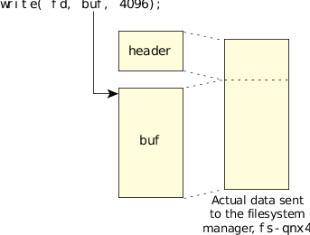Figure 1. The fs-qnx4 message example, showing contiguous data view.So, the client has decided to send 4 KB to the filesystem. (Notice how the C Library stuck a tiny header in front of the data so that the filesystem could tell just what kind of request it actually was—we'll come back to this when we look at multi-part messages, and in even more detail when we look at resource managers.) The filesystem reads just enough data (the header) to figure out what kind of a message it is:
