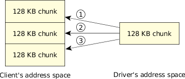 The driver might have a 128 KB area for DMA data transfers, and then message-pass it piecemeal into the client's address space using MsgWrite() (incrementing the offset by 128 KB each time, of course). Then, when the last piece of data has been written, the driver will MsgReply() to the client.