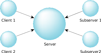 Figure 1. Server/subserver model.If you were doing a job like this, you'd start by hiring some extra employees. These employees would all come to you (just as the subservers send a message to the server—hence the note about the arrows in the diagram above), looking for work to do. Initially, you might not have any, so you wouldn't reply to their query. When someone comes into your office with a folder full of work, you say to one of your employees, "Here's some work for you to do." That employee then goes off and does the work. As other jobs come in, you'd delegate them to the other employees.