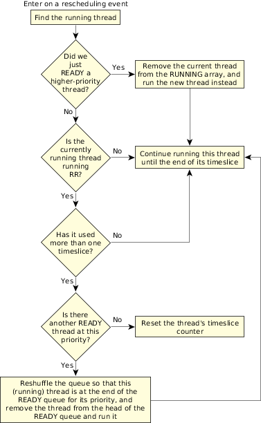 Figure 1. Scheduling roadmap.For a multiple-CPU system, the rules are the same, except that multiple CPUs can run multiple threads concurrently. The order that the threads run (i.e., which threads get to run on the multiple CPUs) is determined in the exact same way as with a single CPU—the highest-priority READY thread will run on a CPU. For lower-priority or longer-waiting threads, the kernel has some flexibility as to when to schedule them to avoid inefficiency in the use of the cache. For more information about SMP, see the Multicore Processing User's Guide .