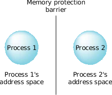 Reliability, though, is perhaps the most important point. A process, just like a house, has some well-defined "borders." A person in a house has a pretty good idea when they're in the house, and when they're not. A thread has a very good idea—if it's accessing memory within the process, it can live. If it steps out of the bounds of the process's address space, it gets killed. This means that two threads, running in different processes, are effectively isolated from each other.