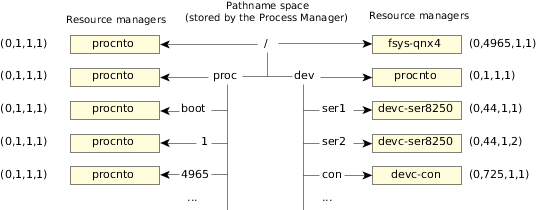 Figure 1. QNX Neutrino's namespace.We do notice, however, that fs-qnx4 has registered its association of ND/PID/CHID at the pathname "/." Although it's not shown on the diagram, fs-qnx4 registered itself as a directory resource manager—it told the process manager that it'll be responsible for "/" and below. This is something that the other, "device" resource managers (e.g., the serial port resource manager) didn't do. By setting the "directory" flag, fs-qnx4 is able to handle the request for "/etc/passwd" because the first part of the request is "/"—a matching component!