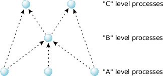 In the following diagram, processes at the A level can send to processes at the B or C level. Processes at the B level can send to the C level but they should never send to the A level. Likewise, processes at the C level can never send to those at the A or B level. To A, B and C are servers. To B, A is a client and C is a server.