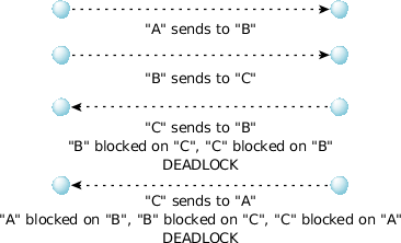 Figure 2. A deadlock when sending messages improperly among processes.There are common situations which require communication to flow backwards through the hierarchy. For example, A sends to B requesting notification when data is available. B immediately replies to A. At some point in the future, B will have the data A requested and will inform A. B can't send a message to A because this might result in deadlock if A decided to send to B at the same time.