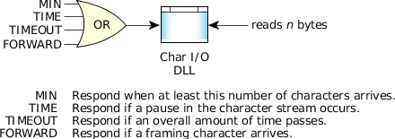 M T 0 Return with up to n bytes when either M bytes are available, or at least one byte has been received and the inter-byte time between any subsequently received characters exceeds T * .1 sec.