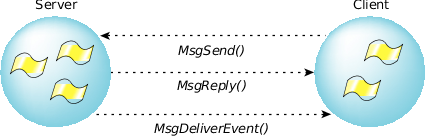 In order to understand how message passing works, consider two processes that wish to communicate with each other: a client process and a server process. First we consider a single-node case, where both client and server reside in the same machine. In this case, the client simply creates a connection (via ConnectAttach()) to the server, and then sends a message (perhaps via MsgSend()).