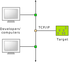 Figure 1. Several developers can debug a single target system.TCP/IP static port connection