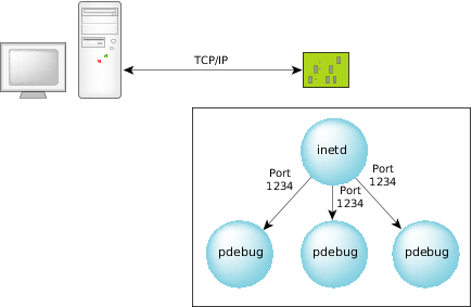 Figure 3. For a TCP/IP dynamic port connection, the inetd process manages the port.Note that this method is also suitable for one or more developers. It's effectively what the qconn daemon does to provide support to remote IDE components; qconn listens to a port and spawns pdebug on a new, dynamically determined port.
