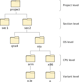 Here's a sample directory tree for a product that can be built for two different operating systems (QNX 4 and Neutrino), on two CPU platforms (x86 and ARM):