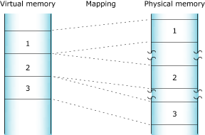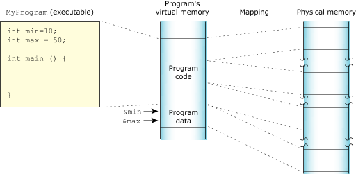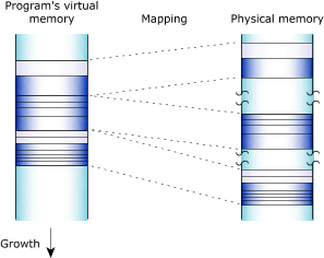 Figure 2. How the process manager allocates memory into pages.The process manager allocates memory in small pages (typically 4 KB each). To determine the size for your system, use the sysconf() function.