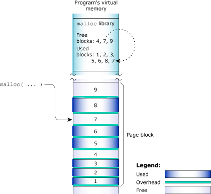 Figure 9. The allocator manages the blocks of memory.Each allocation uses a small amount of fixed overhead to store internal data structures. Since there's a fixed overhead with respect to block size, the ratio of allocator overhead to data payload is larger for smaller allocation requests.