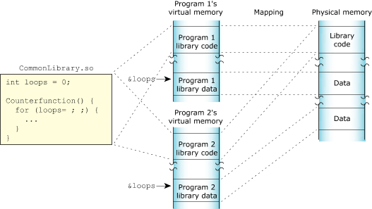 Shared-library memory stores the libraries you require for your process. Like program memory, library memory consists of both code and data sections. In the case of shared libraries, all the processes map to the same physical location for the code section and to unique locations for the data section:
