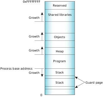Figure 3. Process memory layout on an x86.In reality, it's a little more complex. The various types of allocations, stacks, heap, shared objects, etc. have separate places where the memory manager starts looking for free virtual address space. The relative positions of the starting point for the search are as indicated in the diagram. Given those starting points, the memory manager starts looking up (if MAP_BELOW isn't set) or down (if MAP_BELOW is set) in the virtual address space of the process, looking for a free region that's big enough. This tends to make allocations group as the diagram shows, but a shared memory allocation, for example, can be located anywhere in the process address space.