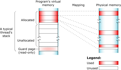 The used portion of the stack holds your thread's state information and takes up physical memory. The unused portion of the stack is initially allocated in virtual address space, but not physical memory: