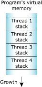 Figure 5. The stack memory.When the process manager creates a thread, it reserves the full stack in virtual memory, but not in physical memory. Instead, the process manager requests additional blocks of physical memory only when your program actually needs more stack memory. As one function calls another, the state of the calling function is pushed onto the stack. When the function returns, the local variables and parameters are popped off the stack.