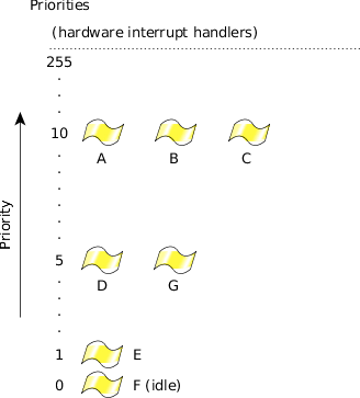 Figure 1. Thread priorities range from 0 (lowest) to 255 (highest).Although interrupt handlers aren't scheduled in the same way as threads, they're considered to be of a higher priority because an interrupt handler will preempt any running thread.