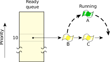 next READY thread (Thread B) now runs.A timeslice is the unit of time assigned to every process. Once it consumes its timeslice, a thread is put at the end of its queue in the ready queue and the next READY thread at the same priority level is given control.