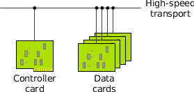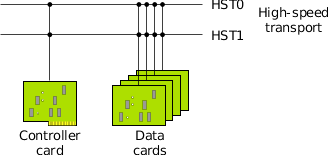 This configuration has a generic controller card and several data cards to start with. These cards are interconnected by a high-speed transport (HST) bus. The controller card configures the box by communicating with the data cards, and establishes/enables data transport in and out of the box (i.e., data cards) by routing packets.