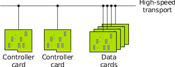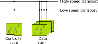 This configuration has asymmetric transport: a High-Speed Transport (HST) and a reliable and economical Low-Speed Transport (LST). You might use the HST for user data, and the LST exclusively for out-of-band control (which can be very helpful for diagnosis and during booting). For example, if you use generic Ethernet as the LST, you could use a bootp ROM on the data cards to economically boot—no flash would be required on the data cards.
