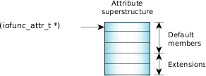 The iofunc_*() default functions operate on the assumption that you've used the default definitions for the context block and the attributes structures. This is a safe assumption for two reasons: