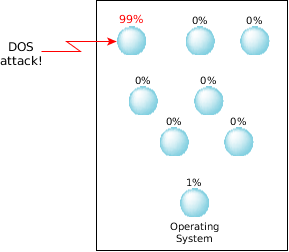 Many systems are vulnerable to Denial of Service (DOS) attacks. For example, a malicious user could bombard a system with requests that need to be processed by one process. When under attack, this process overloads the CPU and effectively starves the rest of the system.