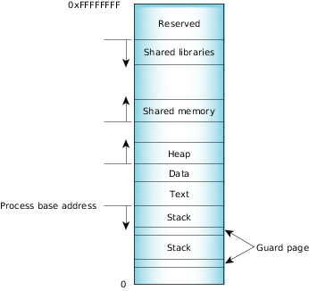 The diagram below shows the memory layout of a typical process. The process load segments (corresponding to "text" and"data" in the diagram) are loaded at the process's base address. The main stack is located just below and grows downwards. Any additional threads that are created will have their own stacks, located below the main stack. Each of the stacks is separated by a guard page to detect stack overflows. The heap is located above the process and grows upwards.