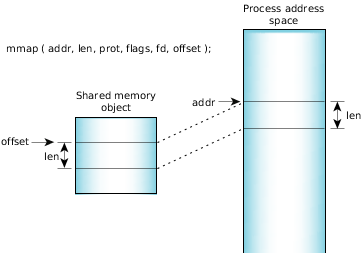 The three arguments fd, offset_within_shared_memory, and length define a portion of a particular shared object to be mapped in. It's common to map in an entire shared object, in which case the offset will be zero and the length will be the size of the shared object in bytes. On an Intel processor, the length will be a multiple of the page size, which is 4096 bytes.