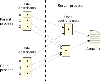The following diagram shows two processes in which one opens a file twice, then does a dup() to get a third FD. The process then creates a child that inherits all open files.