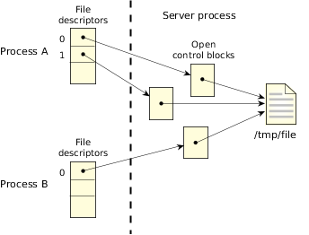 Figure 1. Two processes open the same file.Several file descriptors in one or more processes can refer to the same OCB. This is accomplished by two means: