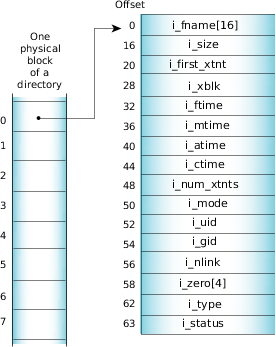 Every directory entry either defines a file or points to an entry within the /.inodes file. Inode entries are used when the filename exceeds 16 characters or when two or more names are linked to a single file. If you've enabled support for long filenames, the root directory of the filesystem also includes the .longfilenames file, which stores information about files whose names are longer than 48 characters.