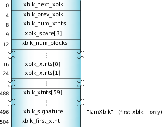The i_xblk field in the directory entry points to one of these extent blocks, which in turn defines where the second and subsequent extents are to be found.