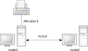 Let's assume we have two nodes, node1 and node2, and node1 has a printer connected to /dev/par1.