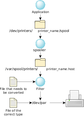 When the spooler sees the print job in /dev/printers/printer_name/raw, it copies the job file to the spooling directory, /var/spool/printers/printer_name.host and invokes the appropriate filter, which prepares the file and then sends it to the printer.