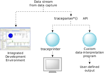 Figure 1. Possible data interpretation configurations.The best tool (by far) for interpreting the copious amounts of trace data is the Integrated Development Environment. It provides a sophisticated and versatile user interface that lets you filter and examine the data. For more information, see the Analyzing Your System with Kernel Tracing chapter of the IDE User's Guide.