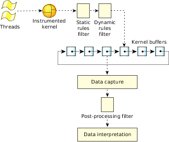 Figure 1. Overall view of the SAT and its filters.Most of the events don't indicate what caused the event to occur. For example, an event for entering MsgSendv() doesn't indicate which thread in which process called it; you have to infer it during interpretation from a previous thread-running event. You have carefully choose what you filter to avoid losing this context.