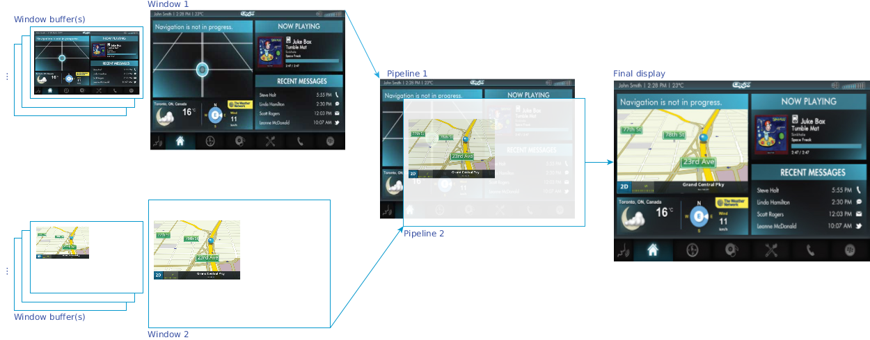 You can also maximize the advantages of both hardware and Screen composition capabilities. What this means is that you can combine multiple windows into one composite buffer, bind this buffer to a pipeline, and still take advantage of hardware capabilities to combine output from multiple pipelines.