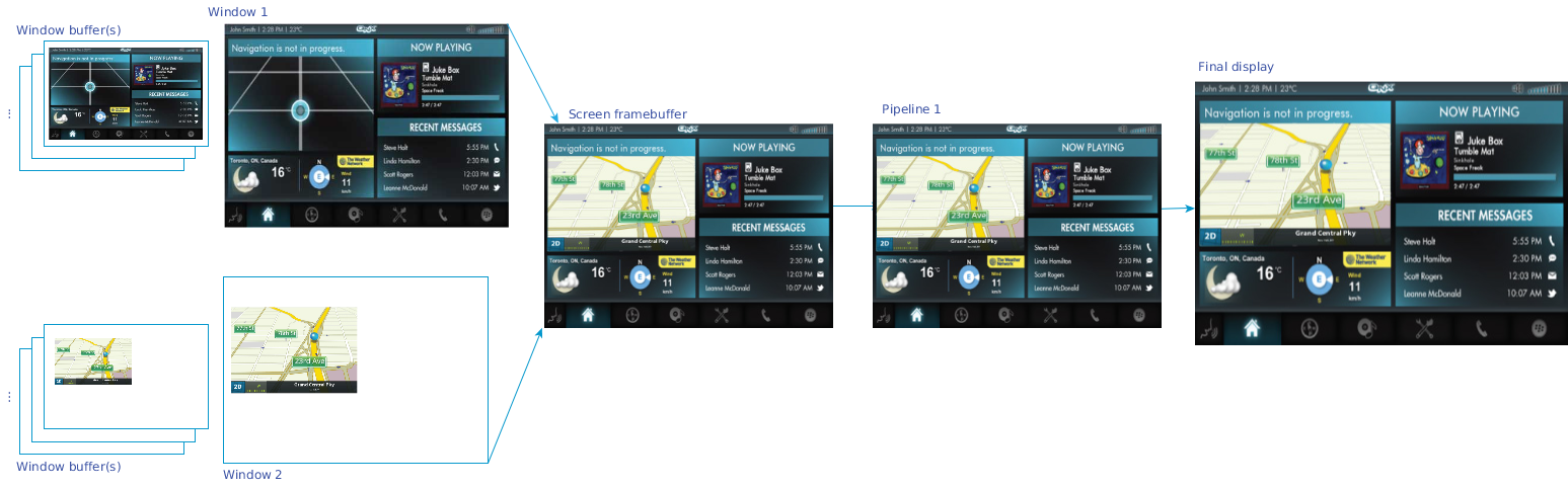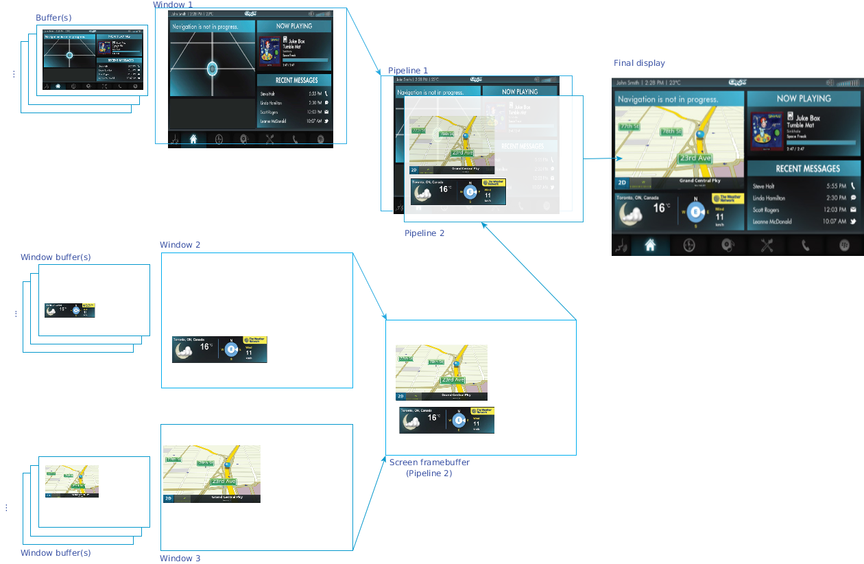 This Screen composition example shows two windows; each window posts a different image. Those images are composed into one composite framebuffer, which binds to the single pipeline. This output is then fed into the associated display port and then onto the display hardware.