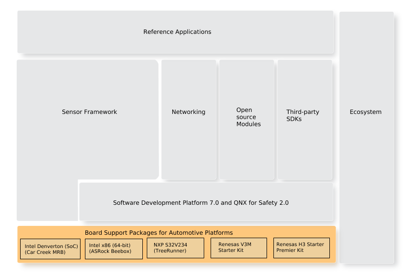 The QNX Platform for ADAS supports several board support packages for Automotive Platforms.