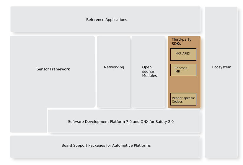 This block in the architecture represents the third-party hardware SDKs and vendor-specific codecs that we have integrated into the QNX Platform for ADAS. We include SDKs that allow your application to access hardware accelerators.