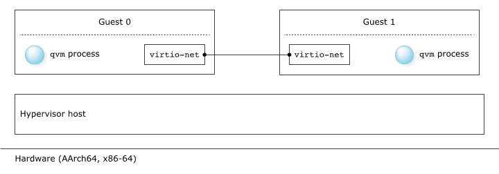 To configure virtio-net vdevs in two guests to establish communication between the guests, specify the generic name option (see Common vdev options in the Configuration chapter) to have a peer vdev appear under /dev/qvm/system_name/vdev_name, where system_name is the value you gave to the system option and vdev_name is the name of the peer vdev (e.g., /dev/qvm/qnx7-x86_64-guest/virtio-net_0).