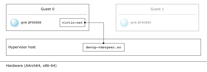 The figure below illustrates a peer-to-peer connection using a virtio-net vdev in a guest and the devnp-vdevpeer.so io-pkt-* driver running in the hypervisor host (see devnp-vdevpeer.so in the Utilities and Drivers Reference chapter).