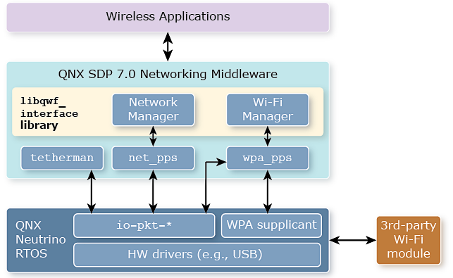 The Network Manager and Wi-Fi Manager components in the libqwf_interface library provide an elaborate